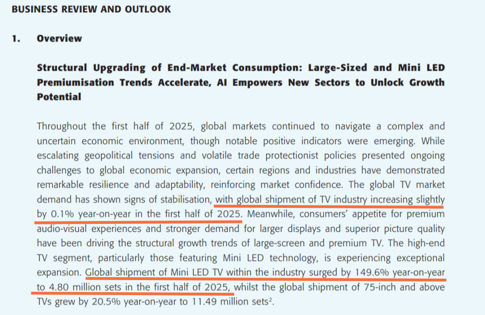 TCL电子2025上半年的财报显示,TCL电视国际市场出货量同比增长0.1%,Mini LED电视也赢得了海外消费者的强烈青睐,其全球出货量同比增长149.6%,达到480万台。