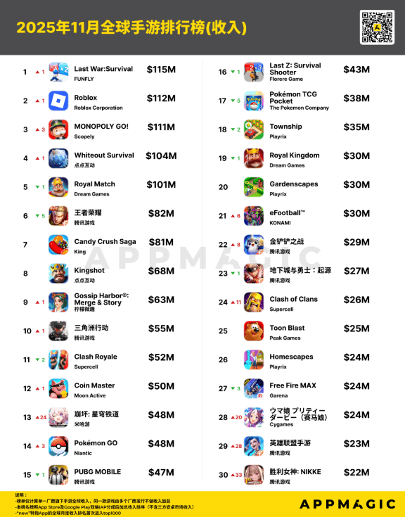 11月收入排行榜显现出明显波动。《Last War:Survival》强势登顶榜首,紧随其后的是《Roblox》《MONOPOLY GO!》。需要注意的是,前五名中仅《无尽冬日(Whiteout Survival)》实现收入增长,其余产品均出现下滑。腾讯旗下《王者荣耀》此次跌出前五,暂居第六。