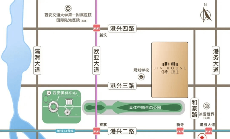 项目港兴路、近距北三环、绕城高速,距离西安行政中心和北客站仅十分钟车程,距咸阳国际机场仅28公里。
