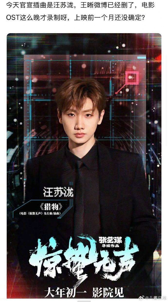 这场删博疑云迅速引发了舆论的关注。网友们翻出了王晰的原文截图,文中提到的一个月研究剧本和张艺谋导演亲自沟通等细节,让人不禁为这位实力派男低音的付出感到心疼。更加耐人寻味的是,电影官宣的三首歌曲分工明确:周深演唱主题曲《选择》,刘宇宁演唱片尾曲《忠诚》,而汪苏泷演唱的《猎物》被特别标注为先行曲兼插曲。时间线的高度重合,让资源顶替的猜测充斥网络,#惊蛰无声王晰#线亿,评论区内糊咖无话语权资本强捧的声音此起彼伏。面对愈演愈烈的争议,电影制作方始终没有正面回应,却通过合作的音乐平台悄悄透露出一些信息。据内部人士透露,王晰原本演唱的插曲因后期剧情大幅删减而被整体废弃,汪苏泷的《猎物》则是为新增的谍战追踪情节创作的新曲。制作人尹约在采访中力挺汪苏泷:他用电子合成器模拟心跳声的处理,完美契合了角色在危机四伏中的心理状态。这番话似乎证实了曲目不同的说法,但网友很快发现了其中的漏洞——王晰在删博前曾明确提到与导演确认最终编曲,若曲目早已被删除,为什么还要进行录音前的沟通?