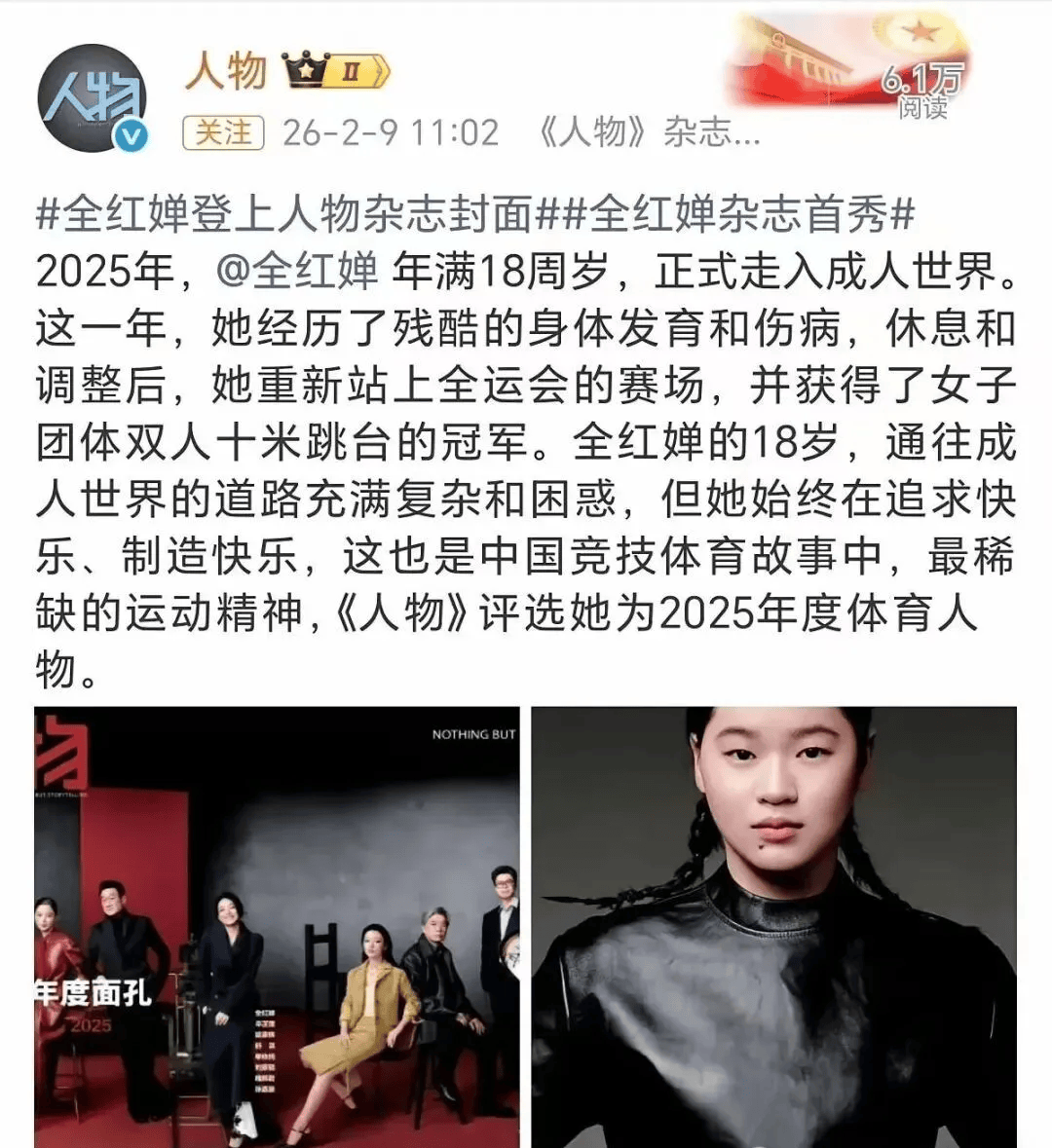 《人物》给全红婵的评价是:“在通往成人世界的复杂道路上,始终追求快乐、制造快乐。”